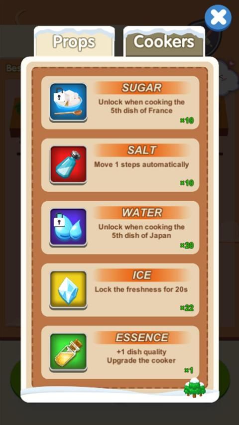Players collect the ingredients for each dish through passes, the player can cook the favorite dishes after collecting enough ingredients. Each dish is judged by a score. In the meantime: