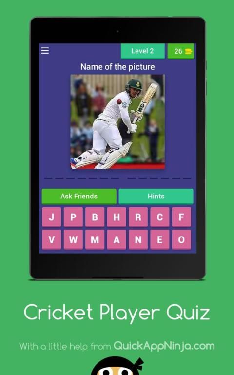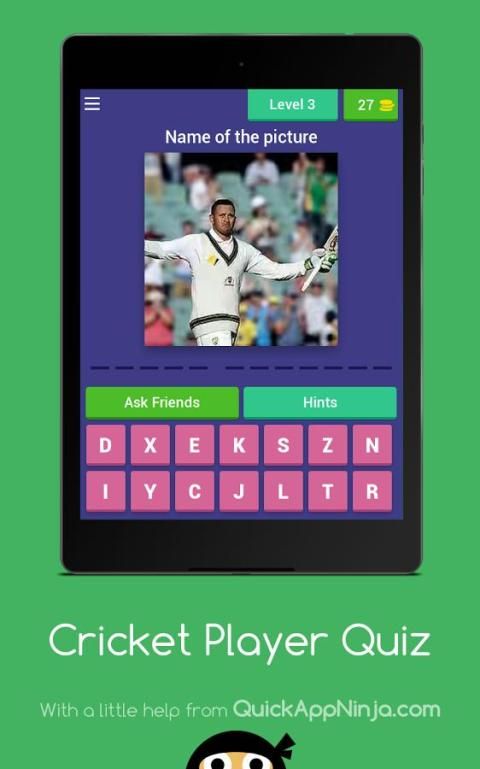क्रिकेट खिलाड़ी से अधिक 50 स्तर के साथ प्रश्नोत्तरी खेल है और इस खेल में लोकप्रिय क्रिकेट खिलाड़ी के अधिकांश उपलब्ध।