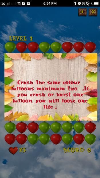 Match and crush the same colour balloons which are connected . You have to find or smash minimum two same colour balloons .If you smash or burst single then you will lose life .If all the life over then you have to start again or refresh the game . Also have to use some brain and logic to popup two balloons . More you match more than balloons more the levels you will pass . This game can be played by all enjoy the game.
