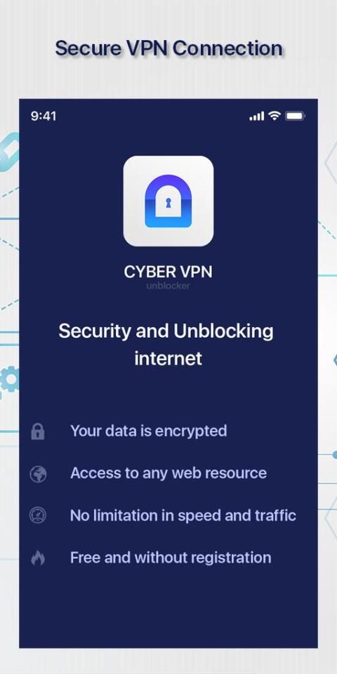 साइबर वीपीएन को पंजीकरण की आवश्यकता नहीं होती है, इसे मुफ्त में वितरित किया जाता है और इस तरह के अधिकांश अनुप्रयोगों के विपरीत, उपयोगकर्ता के डेटा को नहीं बचाता है।
