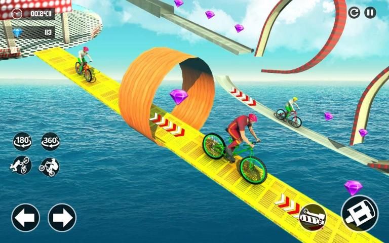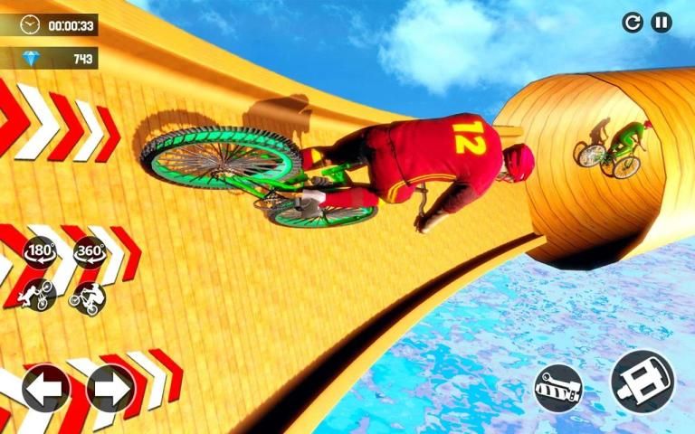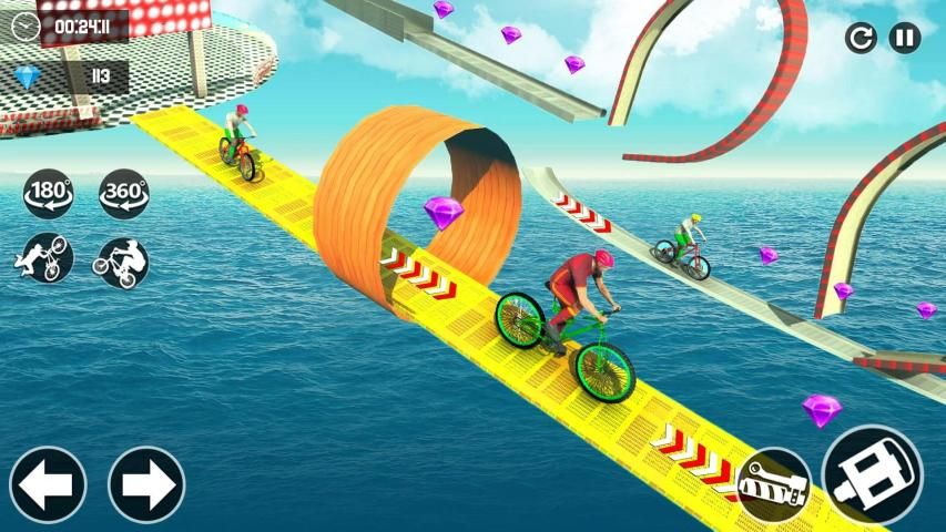 In this Bicycle Stunts Extreme Racer 3D: Impossible Tracks, ride fast and be a king of high jumps ramps with giant cycle racer. Choose your best rider from garage. Take hold on mage ramps. Jump from one ramp to other speedy as like reckless racer stunt master. Time is short to complete the task so ride fast & fast to fulfill the riding skills. Perform as solo stunts and unleash your inner beast. On high ramps with bicycle stunts use the speed to cross it. Collect all diamonds and stars to unlock the new ramps and bicycles. Number of cycles here to perform stunts but you have to first unlock them to ride on. Jump on heavy bicycle and start the missions. Enjoy the variety of heavy giant cycles with stunts ramps on trial tracks. The ultimate riding with multi action bicycle stunts avoid to jump in water otherwise level will fail. Enjoy Cycle Stunt on Impossible Track & Be Trick Master of Reckless Cycle Racer.