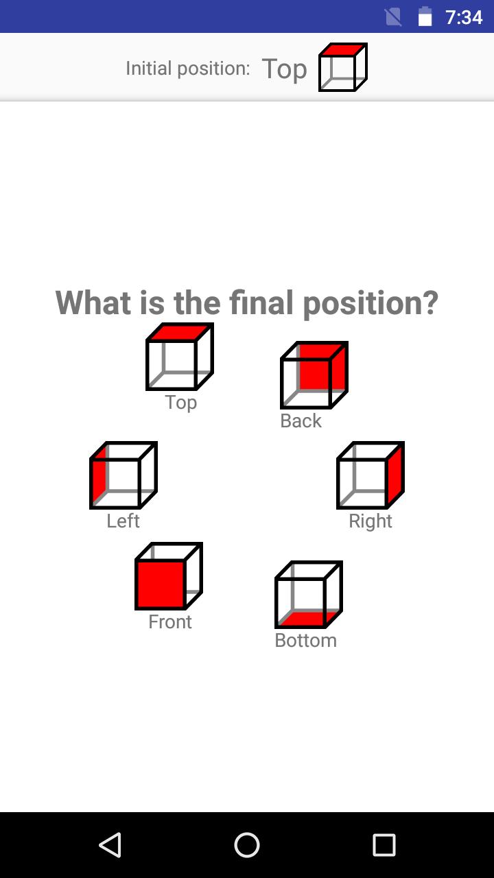 • The red side is the BOTTOM one, command is LEFT, the cube should be tipped over it's left bottom edge and the red side is now the RIGHT side.