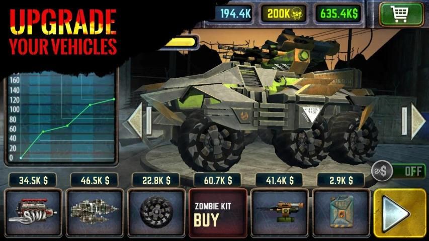 मार और के रूप में आप कर सकते हैं के रूप में कई लाश को मुंहतोड़ द्वारा पैसे ले लीजिए। शांत डीजल में अपने वाहन, हथियार और कवच के उन्नयन के लिए सिक्के का प्रयोग करें! इन उन्नयन में मदद कर सकता है आप अपने वाहन की गति और अपने आग की दर बढ़ रही है, जब शातिर लाश का सामना करना पड़ द्वारा एक उच्च स्कोर मिलता है!