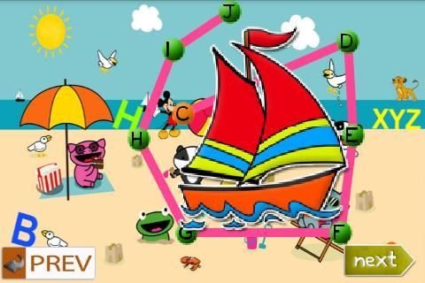 बच्चों डॉट्स जोड़ने के द्वारा आसानी से अक्षर लिखना सीख। कार्यक्रम को जोड़ने डॉट्स द्वारा छवि को पूरा करने के लिए बच्चों से पूछते हैं कि 10 चित्र शामिल हैं।