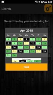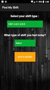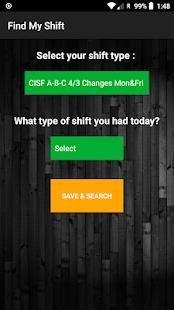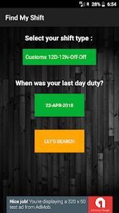 पिछले / भविष्य में किसी भी दिन के लिए अपने शिफ्ट प्रकार का पता लगाएं। सी आई एस एफ / सीमा शुल्क / आप्रवासन के लिए। वर्तमान में समर्थित पारी प्रकार: -