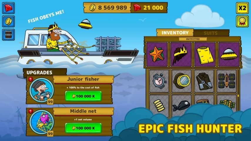 Travel around the aquatic world full of fishes and treasures. Get them with a fishnet, create your team of fishers, upgrade the boat and become the best of the fish master!