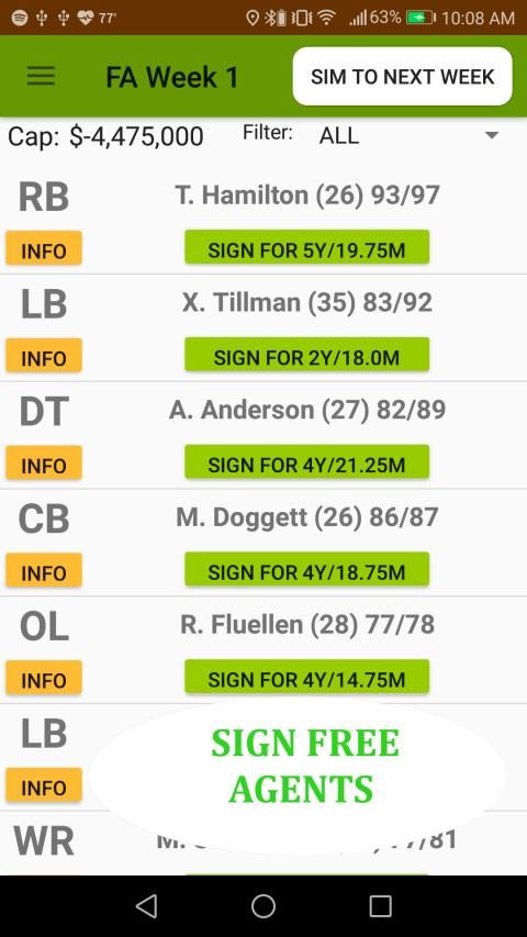 * Sign players in free agency. The game has 5 weeks of free agency and each week the players become cheaper to sign