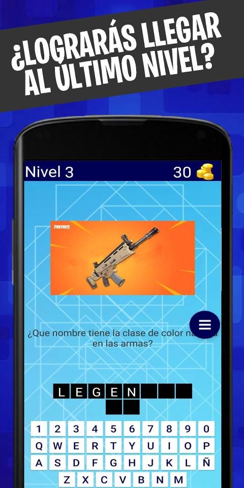 El juego cuenta con una variedad de niveles donde en cada uno de ellos deberás leer detalladamente la pregunta y responder con tus sabios conocimientos acerca del juego. Al acertar, ganaras monedas y alcanzaras el siguiente nivel. Esto no es un juego oficial de fornite ni de Epic Games. Fornite Quiz fue desarrollado por jugadores para jugadores fans de fortnite.