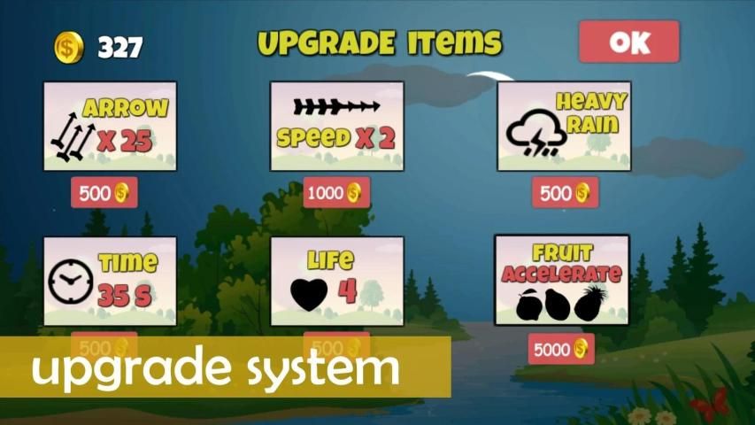 - Use the bow and the arrows to hit the fruits and get combo cool.