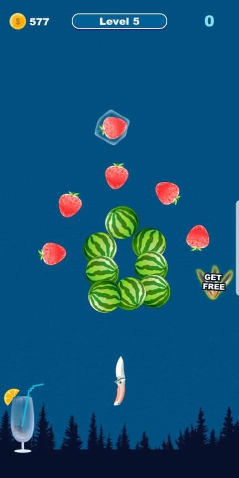 Throw flying knife and cut off the fruit! Cut all the fruits to pass. The mysterious treasure chest is frozen in the level, crush it to get rewards!