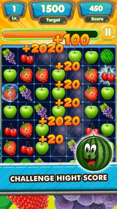 साफ दो या अधिक समान फल स्कोर अंक के लिए, अधिक combos बनाने के लिए खेल रंगमंच की सामग्री का उपयोग करने की कोशिश!