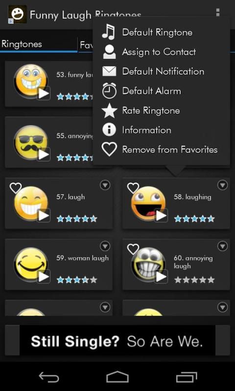 ये अजीब हंसी रिंगटोन बनाने के लिए आप मुस्कान और हंसी के लिए गारंटी रहे हैं! मज़ाकिया हँसो रिंगटोन बॉक्स उच्च गुणवत्ता हँस और हँसी लगता है कि आप अपने संपर्क रिंगटोन, अधिसूचनाओं या अलार्म लगता है असाइन कर सकते हैं शामिल हैं.