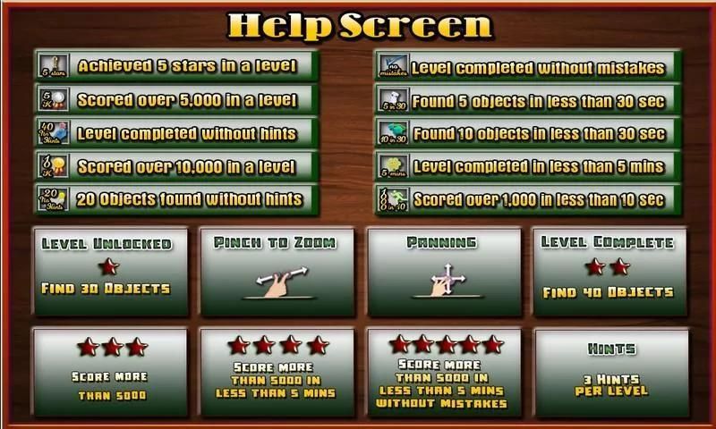 • एक काम संकेत सुविधा यादृच्छिक वस्तुओं के रूप में चित्रों में छिपे खजाने खोजने के लिए।