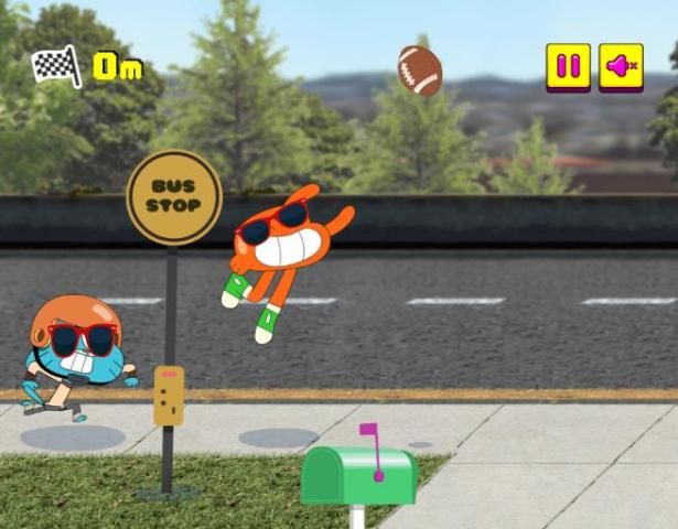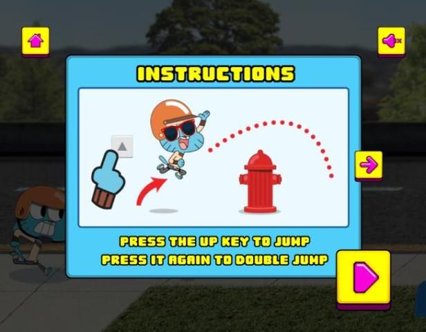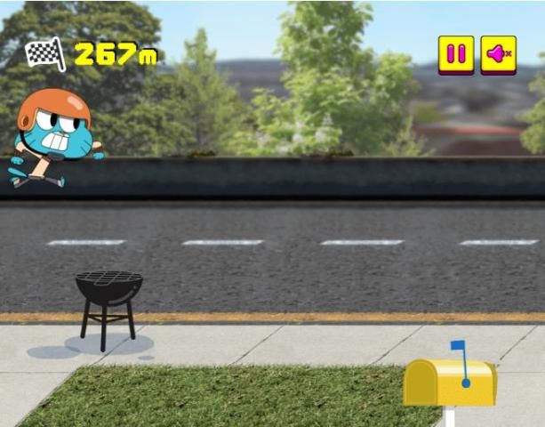 Tap “up” to jump over the bicycles, the pots, the cereal boxes, and all the other objects that stand in Gumball’s way. Double tap on it to perform a double jump if the objects are too tall. Be careful not to hit your head in the objects that are tied up above the street. If you come across some cardboard barriers, Tap in the left to take them down.