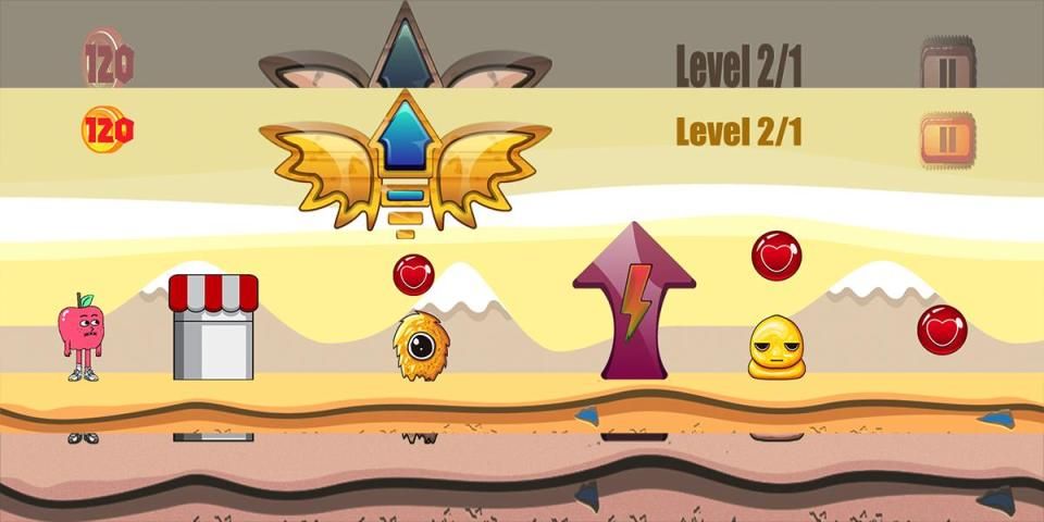 The game Apple and onion starts from the levels easy to difficult, it contains 4 worlds Each world contains 6 levels that start from easy to difficult, and if you want to open the three worlds you must collect the coins that are very important in the game, and the game contains many monsters And the player can kill some monsters, and some monsters cannot kill them.