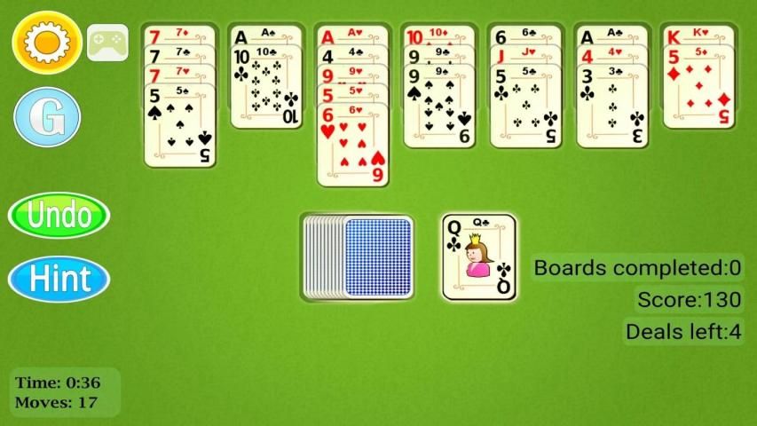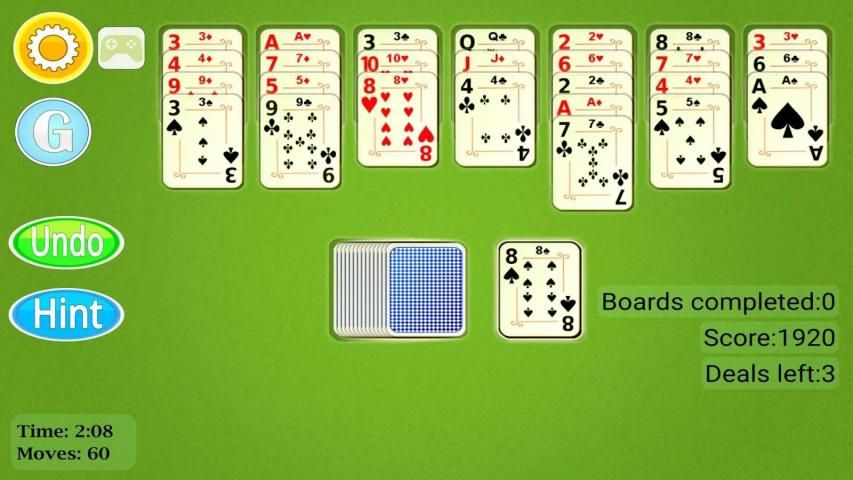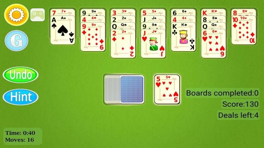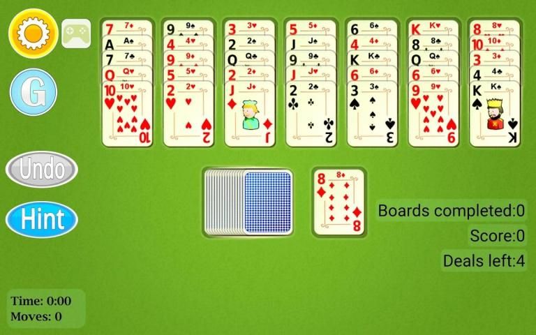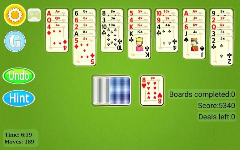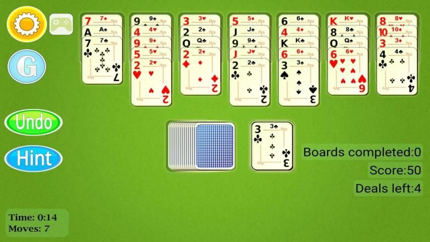 आप 7 स्तंभों के एक बोर्ड के साथ शुरू होगा, 5 कार्ड के साथ प्रत्येक, सभी का सामना। तल में आप कार्ड के ढेर और एक नींव ढेर मिल जाएगा। खेल का लक्ष्य कार्ड है कि कर रहे हैं नींव ढेर में एक से एक कम या एक उच्च दोहन से यथासंभव अधिक से अधिक बोर्डों को अनुमति देना। आप किसी भी कॉलम से कोई भी खुला कार्ड से मेल कर सकते हैं।