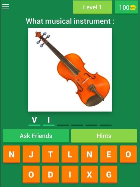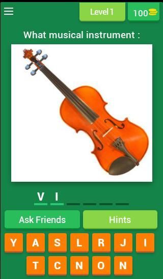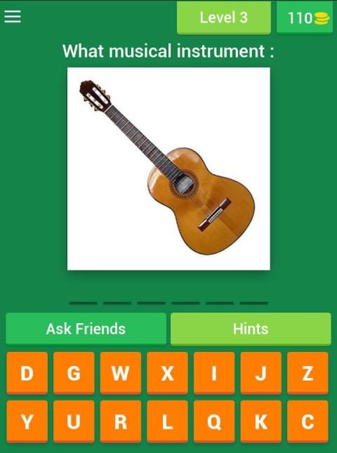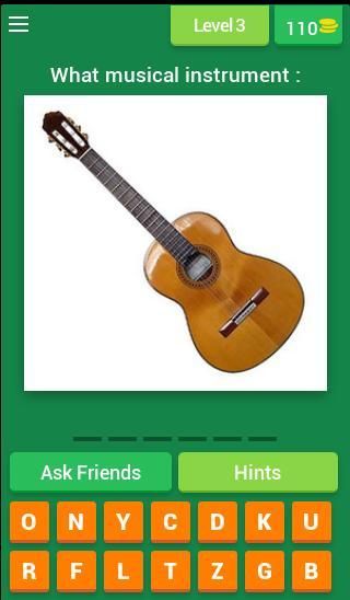आप संगीत वाद्ययंत्र अनुमान करने के लिए उपलब्ध स्थान पर सही पत्र लगाने के द्वारा प्रत्येक स्तर के पास है।