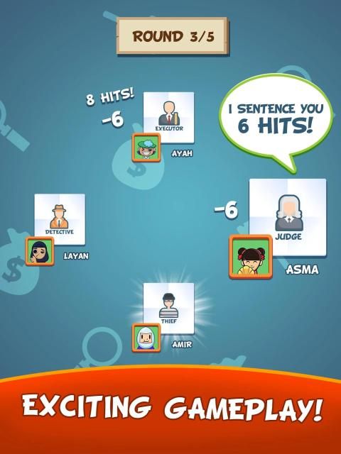 • Executioner: hit the Thief the exact number of hits ordered from the judge or else, he/she will receive the punishment.