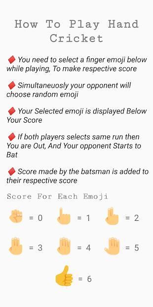 हैंड क्रिकेट एक ऐसा गेम है जिसमें दो खिलाड़ी अपनी संबंधित उंगलियों पर स्कोर दिखाते हैं। अगर स्कोर बराबर हैं, तो बल्लेबाज को घोषित कर दिया जाता है। अन्यथा, बल्लेबाज का स्कोर बल्लेबाजी टीम के कुल रनों में जोड़ा जाता है।