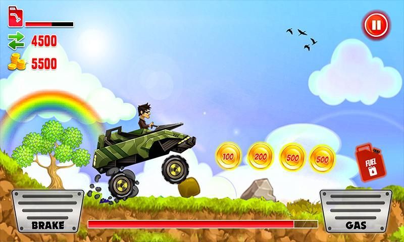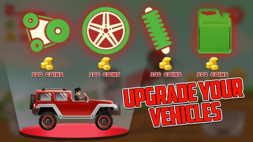 Face the challenges of unique hill climbing environments with many amazing modern and monster trucks and cars. Gain bonuses from daring tricks and collect coins to upgrade your car and reach even higher distances. Earn more to refuel gasoline and upgrade car engine and fuel tanks otherwise you will easily run out of fuel.