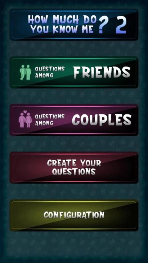 This game calculates how much you and your friend or couple know each other after answering a series of questions. First you have to answer personal questions that will be different depending on who you're playing with. Then you must let the other person with whom you play answer the same questions, trying to get their answers match yours. At the end of the game you will get a total score set by the number of coincidences in your responses. Also, the application will give another score about the relationship between the two of you.