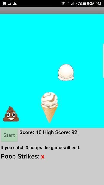 The challenge is to catch as many scoops of ice cream as possible while trying to avoid catching any poops. As the game progresses the falling process gradually speeds up and makes the game even more challenging!
