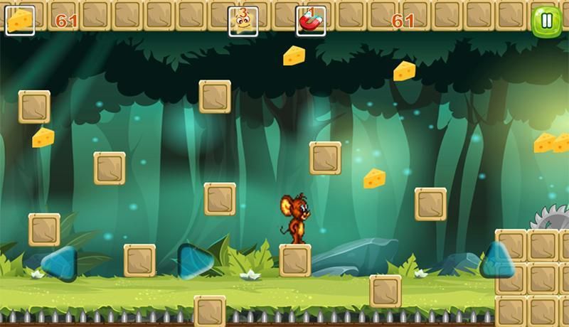 + In the Jungle Jerry Adventure Run, you will not have to run through levels but you have to jump and dodge monsters and obstacles as well. You can also collect cheese to power up Jerry