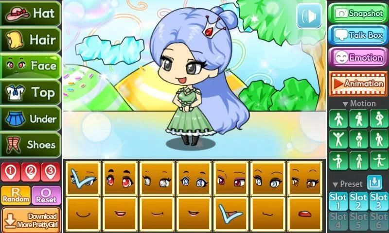 You can change the background, 9 poses and motions, you can also store your Pretty Girl in 6 slots.