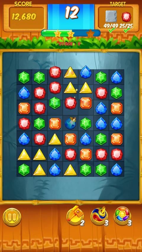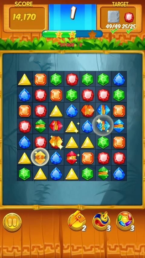Match 3 or more of the same jewels in a row and reach the indicated goals in each level.
