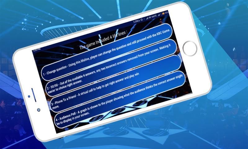 KBC 2018 is India's Gk Quiz Game. If you are planning for competitive exams then this is the best place for you. MPSC, IPS, IAS, GPSC, UPSC, SBI(PO, Clerk), IBPS(PO, Clerk), RRB, RBI(Grade B Officer, Assistant), Insurance - LIC AAO, NICL AO, GICL AO, UIIC AO exams, Bank exams preparations can be done from this game. KBC 2018 game will blow your mind.
