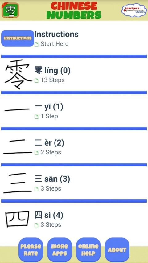 This app includes number Chinese characters for numbers 0-10. Each for the Chinese characters also includes the Pinyin name as well an example of its sound to fully help the student learning Chinese.