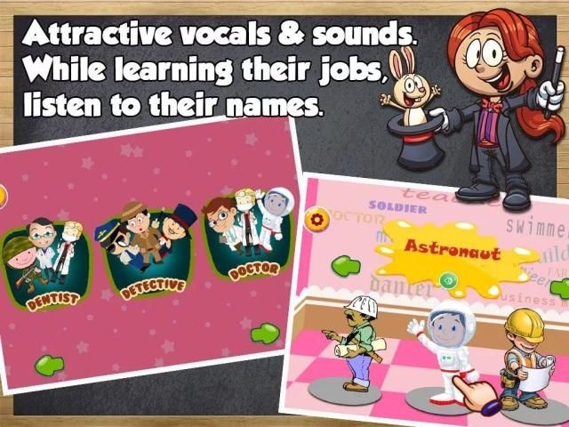 जानें और अभ्यास व्यवसायों, नौकरियां और बायो इस शिक्षा मजेदार खेल को सीखने के माध्यम से। व्यवसायों और व्यवसाय के बच्चों के लिए एक इंटरैक्टिव शब्दावली सीखने खेल है।