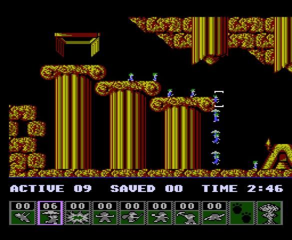 The objective is to guide a group of lemmings through a number of obstacles to a designated exit. To save the required number of lemmings to win, one must determine how to assign a limited number of eight different skills to specific lemmings that allow the selected lemming to alter the landscape, to affect the behavior of other lemmings, or to clear obstacles to create a safe passage for the rest of the lemmings.