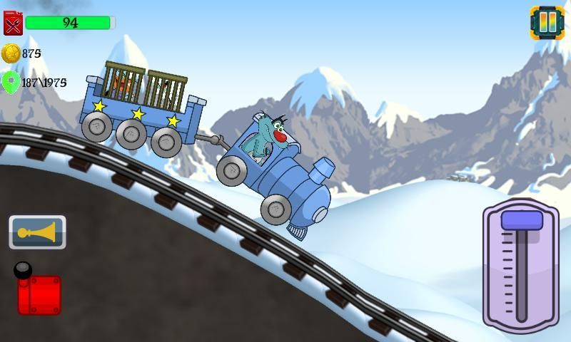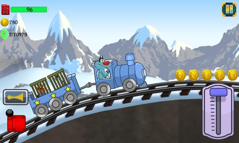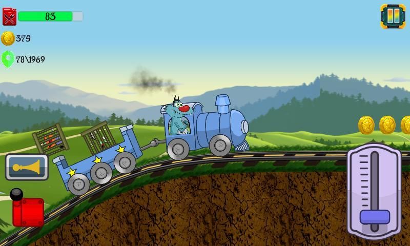 In this train driving game oggy riding a train kids to dispose of four cockroaches who like to steal food at his house, oggy confines the cockroaches the funds take him by train kids to a very far place but ogy have to mountain climb with the train kids.