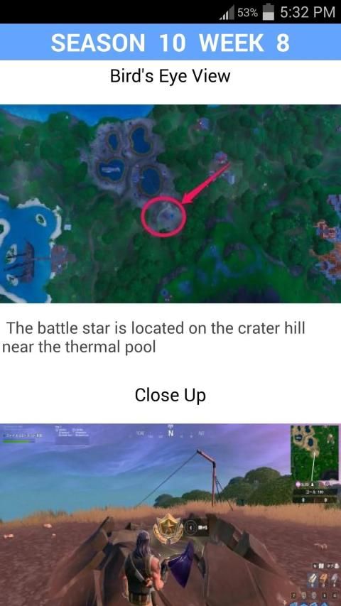 In the app you will find tips to the challenges of the battle pass in the popular game mode Battle Royale. By selecting the desired season and week in the app, you will see the challenges to it and maps with detailed tips on their implementation.