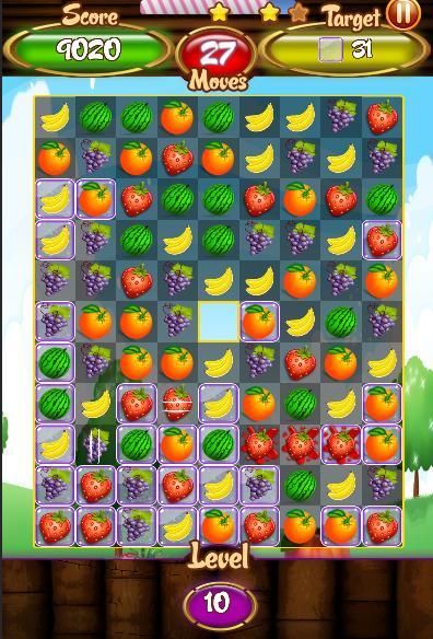 फल मिटा द्वारा बात मिलता है। आप फल की लंबी श्रृंखला अधिक अंक प्राप्त करने के लिए कर सकते हैं!