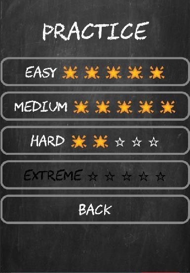 अभ्यास मोड - आसान (इसके अलावा और घटाव) में अपने गणित कौशल का अभ्यास, मध्यम (गुणन और विभाजन), हार्ड, ठीक है, तुम्हें ड्रिल पता है। यह कठिन है और कठिन हो जाता है। एक बार जब आप तैयार हैं चुनौती के लिए पर जाना है और प्रश्नोत्तरी मुझे कोशिश और मैं एक प्रतिभाशाली मोड हूँ।
