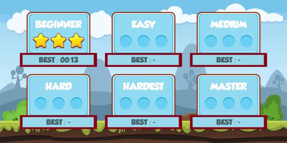 * 6 levels of difficulty - 2 Easy, 2 Normal, 2 Hard with an option to save top score in each level.