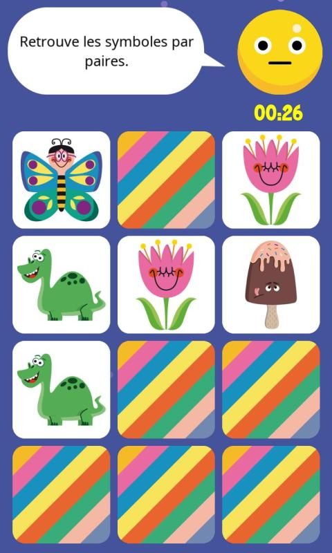 Sur 3 niveaux de difficultés, il s’agit de faire correspondre les différents paires de cartes.