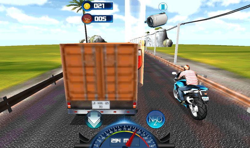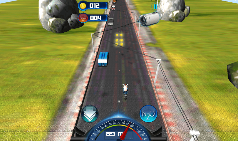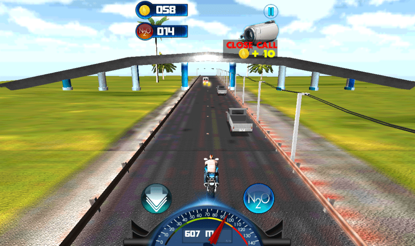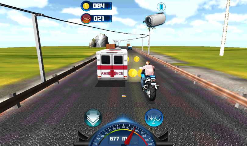 Activate the turbo boost to drive even faster and use collected coins to upgrade your bike at the shop.
