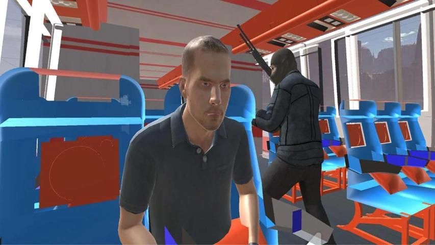 ⎫ फ्यूचरिस्टिक 3 डी, एच.डी. अपहृत विमान में एफपीएस शूटिंग के ग्राफिक्स।
