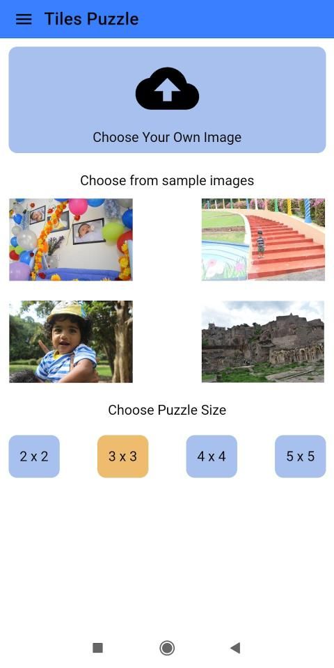 This tiles puzzle can be solved by choosing the image from existing list or you can choose from you own image from your gallery.
