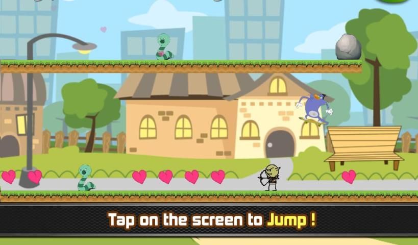 To control the cartoon hero, tap anywhere on the screen to make him jump on the ground upward and let him reach hearts, avoid cockroaches, villain monsters and bricks, by time speed and hardness of the game increase.