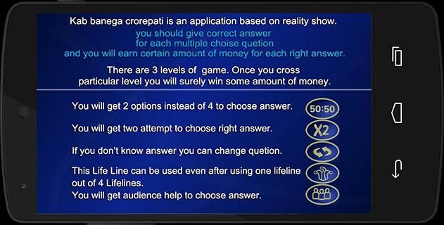 In this KBC 2015 App You will have to give correct answer for each multi choice question.
