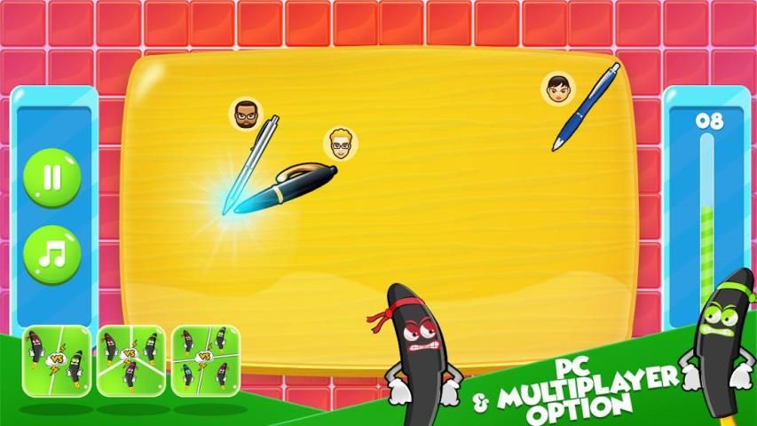 Choose a pen and begin the mighty fight with one, two or three opponents on the table. Swipe across the screen to hit the opponent’s pen, achieve coins after winning of each match, and unlock huger pens with your earnings.