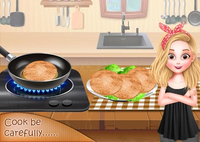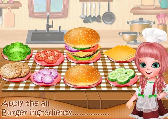 Burger is a type of Fast food consisting of one or more patties usually placed inside bun...Hamburger may contains variety of things as Cheese ,Vegetables,Patties or anything you want to add..Perfect Top Homemade burger needs Onions,Tomato,Cucumber and lettuce to add with beef or chicken patties....Cut these vegies in your own serving style...Be Careful as you don't cut your hand...Mincing Meat to make tasty Patties of Special Burgers...Add ingredients into the meat to make it more delicious and mouth watering burger....Mix all ingredients and make round patties of your hamburger...Fry these Patties into the oil....Fry it in low steam as it turns into golden brown...Now its time to assemble your burger.....take the bun...put tomato sauce onto the bun..now put your Tasty meat Patty....Add all the vegetables over the patty....Add cheese over these vegetables to make it more mouth watering.. Let's become a cook and serve your food lovers..Best fun game ever with fun kids. In burger shop you have Create you own taste with all little buddies...Become the real master chef of this world.. Practice your cooking skills and techniques with our original recipes....