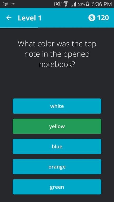 प्रत्येक स्तर की शुरुआत में एक तस्वीर आप को दिखाया गया है। तस्वीर को ध्यान से देखें और आप कर सकते हैं जितना विवरण याद करने की कोशिश। टाइमर बाहर चलाता है, आप इस तस्वीर के बारे में कई सवाल पूछा जाएगा। सही ढंग से सभी सवालों के जवाब देने की कोशिश करें।