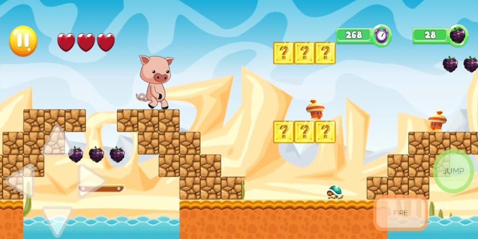 To reach the beautiful princess, piggy will have to run and jump over obstacles, fight and shoot against angry bees, crocodiles, lobsters, snakes, birds, frogs, hedgehog hedgehogs, mushrooms , skeletons, crabs, snails, etc. other dragons. Monsters.