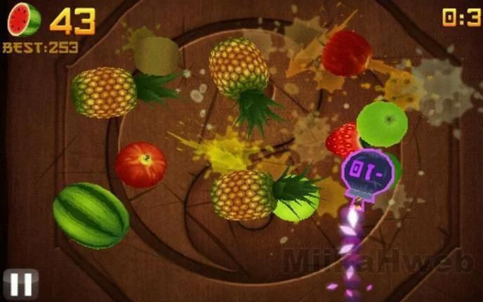 Pizza Ninja is a video game developed by 100 Game Zone. In Pizza Ninja, the player slices Pizza with a blade controlled via the touch screen. As the Pizza is thrown onto the screen, the player swipes their finger across the screen to create a slicing motion, attempting to slice the Pizza in half. Extra points are awarded for slicing multiple Pizzas with one swipe (called "combo"s) , and players can use additional fingers to make multiple slices simultaneously. Players must slice all Pizza ; if three Pizzas are missed, the game ends, (Unless Calligraphy Brush is used) but upon reaching scores that are multiples of one hundred (i.e. 100, 200, 300, etc.), the player will gain an extra life (unless they have not missed a piece of Pizza already). Bombs are occasionally thrown onto the screen, and will also end the game should the player slice them. (Unless Bomb deflects are used)