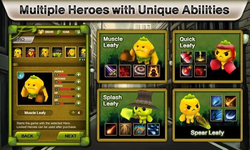 A wide array of Heroes can be purchased with leaves earned throughout battle. Gain experience, level up and unlock secret abilities!